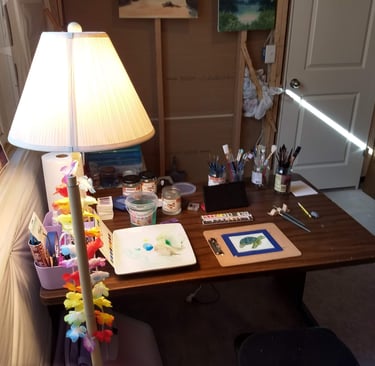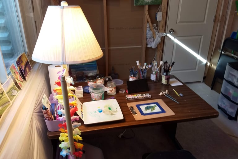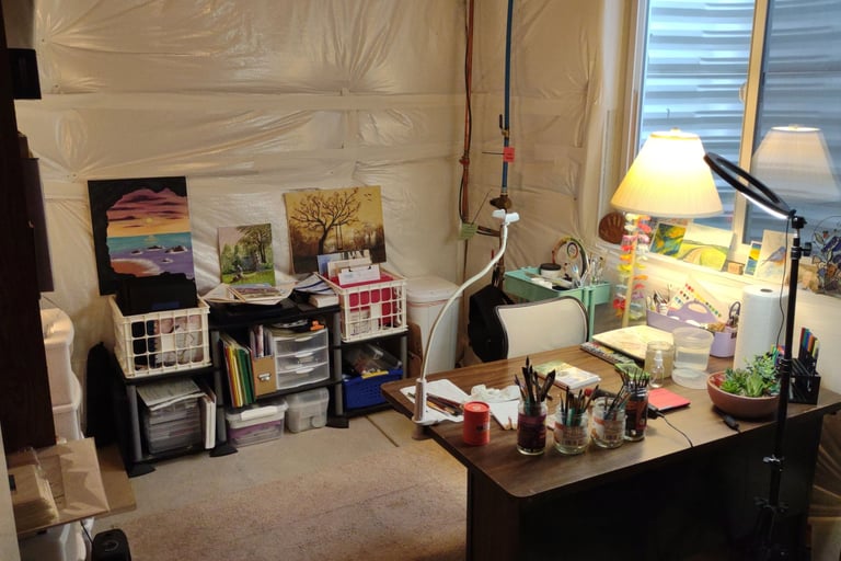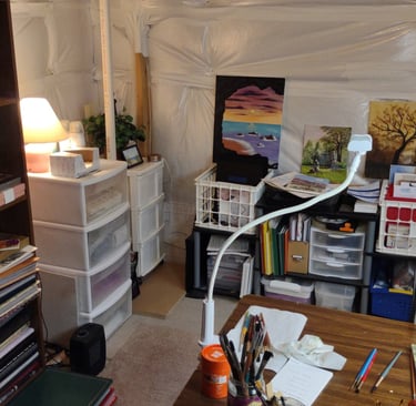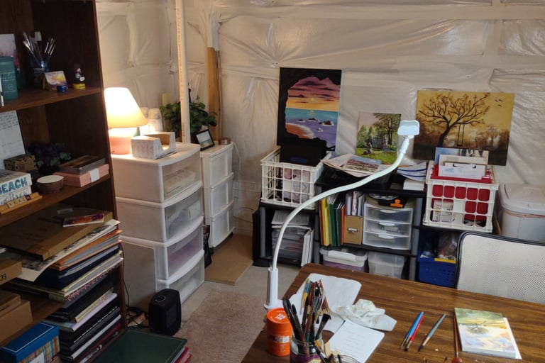 I am very lucky to be able to have a dedicated space in my home for my studio. It's a small, unfinished room in my basement and it's my happy place! It doesn't look like much, but it's all I need to have time to myself and create. I have to be very careful with my space since there is so little of it, but I love organizing and keeping things tidy. Someday, I hope to upgrade to a bigger room with more light, but for now, it's the little studio that could!