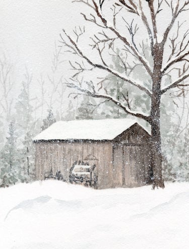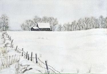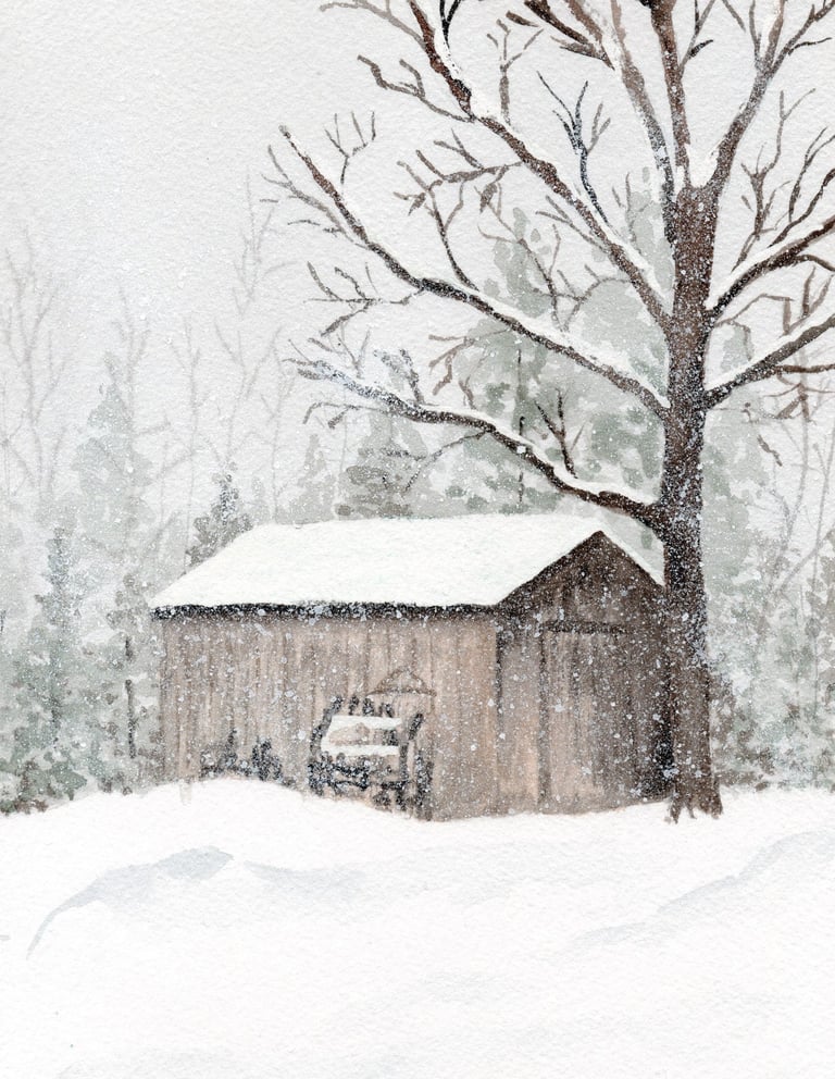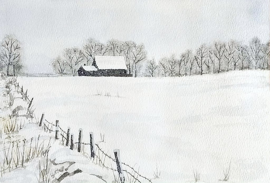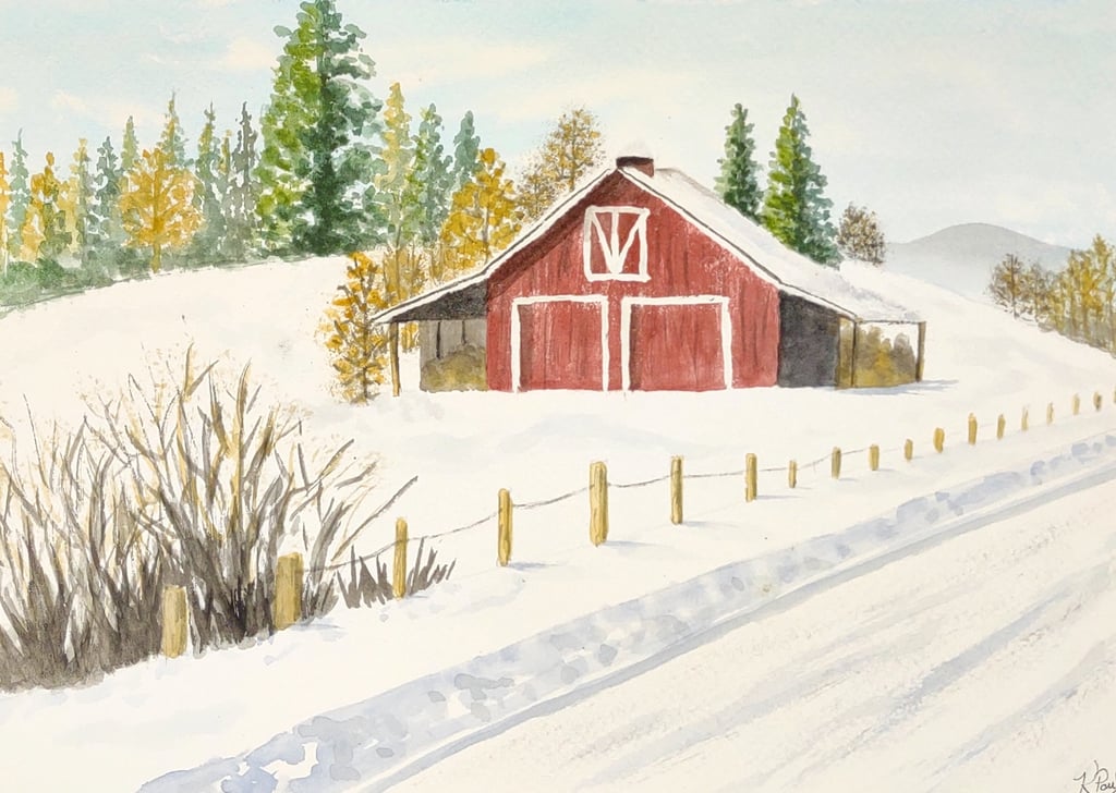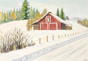 Red Barn and Snow, watercolor on paper, 7 x 10